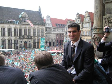 Paul Stalteri on the balcony of the City Hall celebrating the double with the fans below